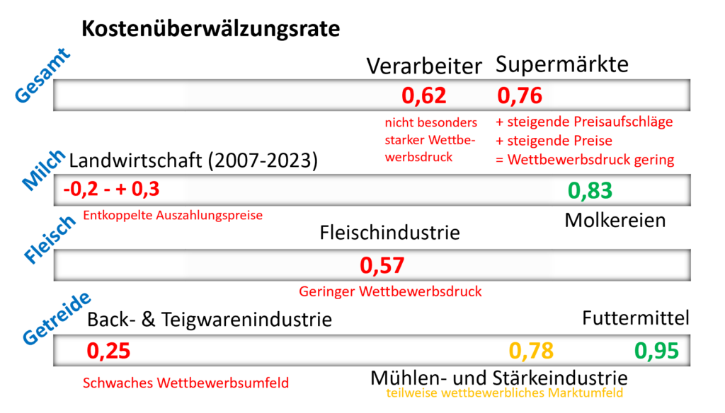 Probleme im Wettbewerb gibt es immer dann, wenn ein Unternehmen einen Markt dominiert und/oder seine Marktmacht missbraucht. Um zu beurteilen, ob die Marktkonzentration bedenkliche Ausmaße angenommen hat, werden üblicherweise folgende Marker herangezogen: 1) die Konzentrationsrate, d.h. der Summe der Marktanteile der Top 4 oder Top 6 umsatzstärksten Konzerne, 2) der Konzentrationsindex, dem sog. Herfindahl-Hirschmann-Index und 3) die Preisaufschläge (Markups). Die Monopolkommission untersucht im Sondergutachten – hauptsächlich bei Milch, Fleisch und Getreide, wie sich die Preise, die Preisaufschläge und die Konzentrationsrate in Deutschland entwickelt haben. Sie analysiert ebenso, inwieweit die Unternehmen auf den verschiedenen Stufen der Lebensmittelkette in der Lage sind, ihre Kosten abzuwälzen (Kostenüberwälzungsrate). Jeder Marker muss im Hinblick auf seine Vor- und Nachteile gegeneinander abgewogen werden. Es kommt also auf eine Gesamtbetrachtung an. Wie sieht diese nun aus?
