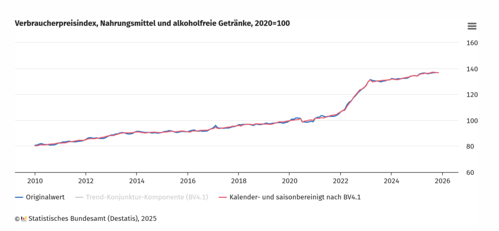 - Die Verbraucherpreise sind in den letzten Jahren und insbesondere in der inflationären Phase nach der Pandemie enorm gestiegen [insbesondere im Vergleich zu anderen EU-Ländern]. Die Preise, die landwirtschaftliche Betriebe für ihre landwirtschaftlichen Produkte bekommen, steigen hingegen in einem viel geringeren Maße. Diese Schere öffnet sich immer weiter.