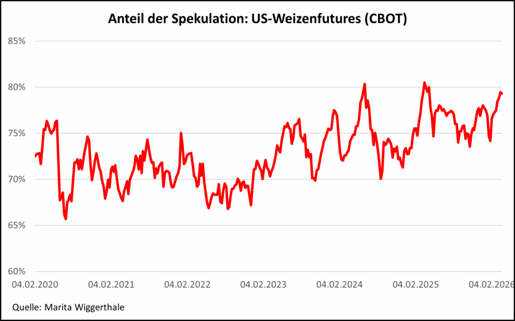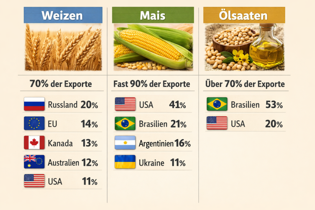 Wenn die Öl- und Gaspreise steigen, dann steigen die Getreide- und in der Folge die Lebensmittelpreise. Das war 1973, 2008 und 2022 der Fall und das ist 2026 zu erwarten. Die Lebensmittel in Deutschland kosten heute immer noch etwa 30 Prozent mehr als 2021. Weltweit decken Mais, Reis, Weizen und Soja rund 60 Prozent der Kalorienversorgung ab. Ein Großteil des internationalen Getreide- und Ölsaatenhandels wird von wenigen Exportländern und Agrarhandelskonzernen dominiert. Letztere können ihr Wissen und ihre Marktposition ausnutzen, um in Zeiten volatiler Märkte an der Börse Wetten auf hohe Lebensmittelpreise abzuschließen.