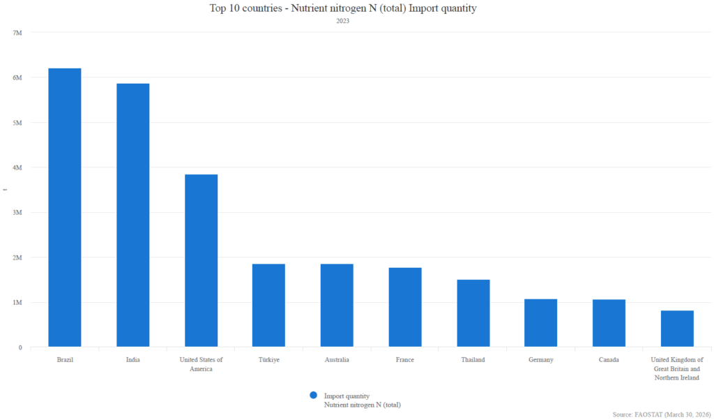 Wenn die Öl- und Gaspreise explodieren, steigen die Düngemittelpreise stark an. Das war 1973, 2008 und 2022 der Fall und das ist aktuell 2026 so. Ein globaler Energieschock zeichnet sich ab. Die fossile Landwirtschaft basiert auf den Düngemitteln Stickstoff (N), Phosphat (P) und Kalium (K). Stickstoffdünger wie Harnstoff benötigt Ammoniak, das aus Erdgas hergestellt wird. Bei der Herstellung macht Erdgas 70 bis 90 Prozent der variablen Kosten aus. Deutschland gehört als kleines Flächenland sogar zu den Top 10 Importeuren von Stickstoffdünger.